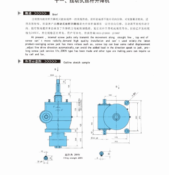 目前國(guó)內(nèi)的絲桿升降機(jī)只能實(shí)現(xiàn)單一的直線傳動(dòng),絲桿的端部不能有徑向位移,對(duì)安裝要求較高,使用范圍較窄。而最新產(chǎn)品的擺動(dòng)式絲桿升降機(jī)是允許絲桿端部有一定得徑向位移,自動(dòng)調(diào)節(jié)直線運(yùn)動(dòng)方向,能有效的避開來自垂直于升降機(jī)方向的附加荷載,延長(zhǎng)絲桿升降機(jī)的使用壽命。目前已開發(fā)的規(guī)格為20KN,其他規(guī)格正在開發(fā),用戶可來電,傳真咨詢:0534-2745030
