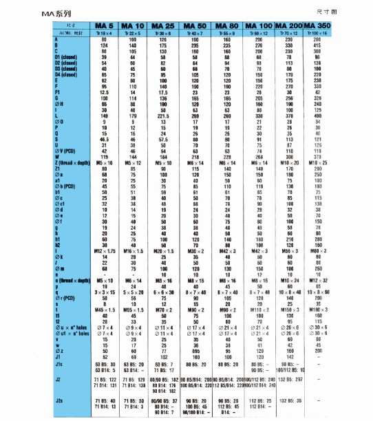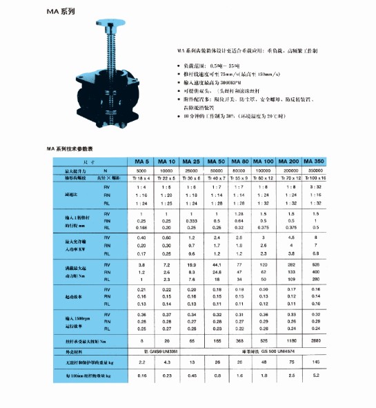 MA螺旋絲桿升降機設(shè)計更適合重載應(yīng)用,重負載,高頻繁工作制,負載范圍0.5噸~35噸,螺旋絲桿升降機升降速度可至75mm/s(最高至150mm /s),輸入速度最高為3000RPM,可提供雙頭,三頭絲杠和滾珠絲杠,10分鐘的工作制為30%(環(huán)境溫度為70℃)